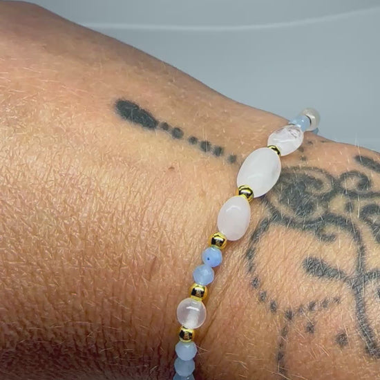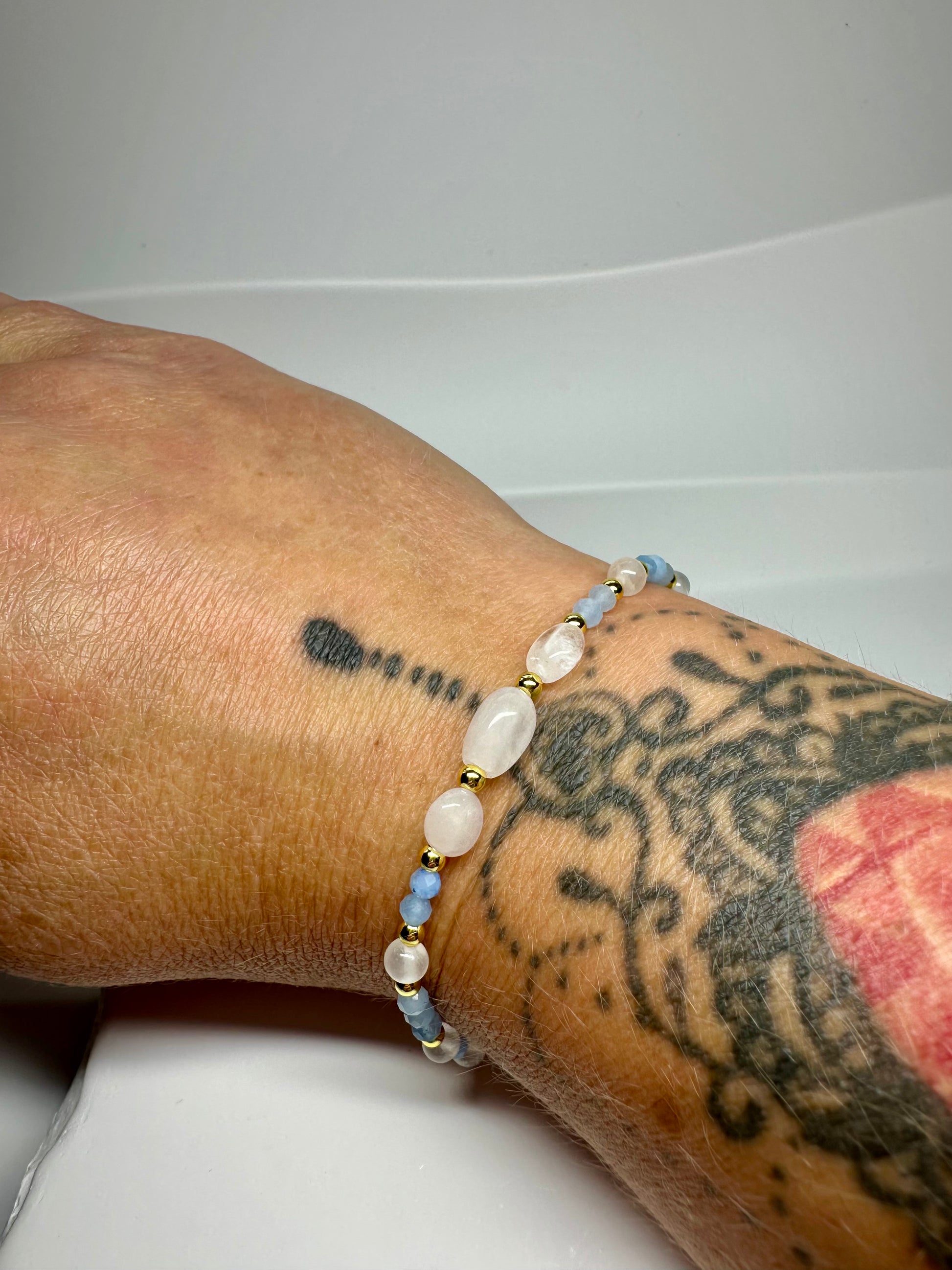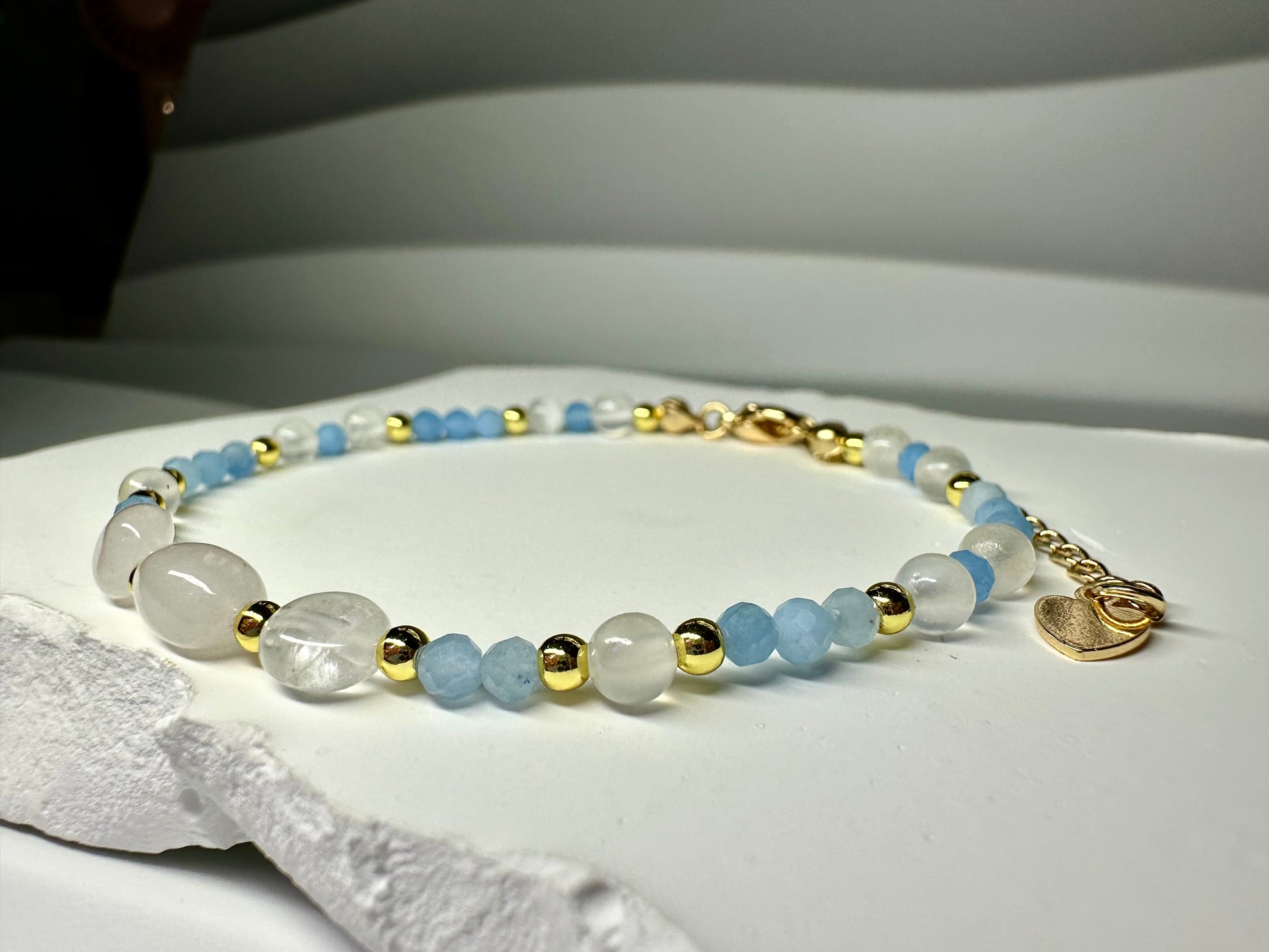 This handcrafted bracelet blends Aquamarine, Rose Quartz, and Selenite—a trio chosen to reflect the visionary, expressive, and emotionally attuned nature of Aquarius. Whether you’re gifting a zodiac lover or honouring your own cosmic identity, this dainty crystal bracelet is a wearable affirmation of clarity, love, and energetic renewal.