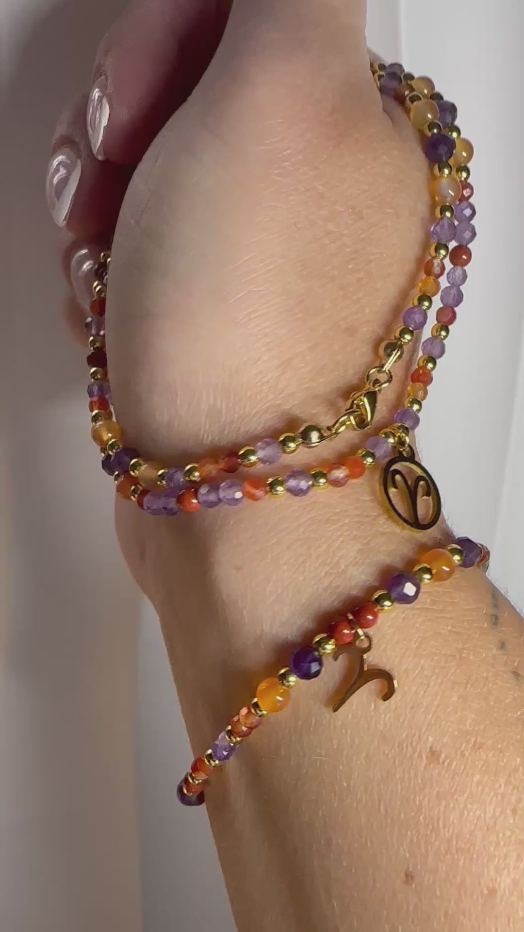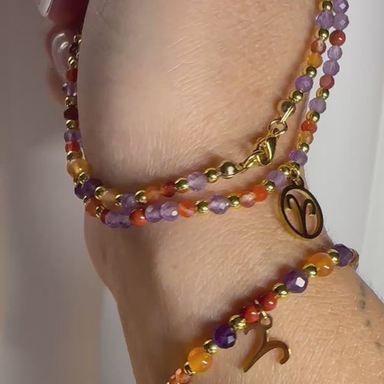 This handmade jewellery duo combines a beaded Carnelian bracelet with a matching Amethyst necklace, designed to embody Aries’ fiery courage while offering soothing balance.