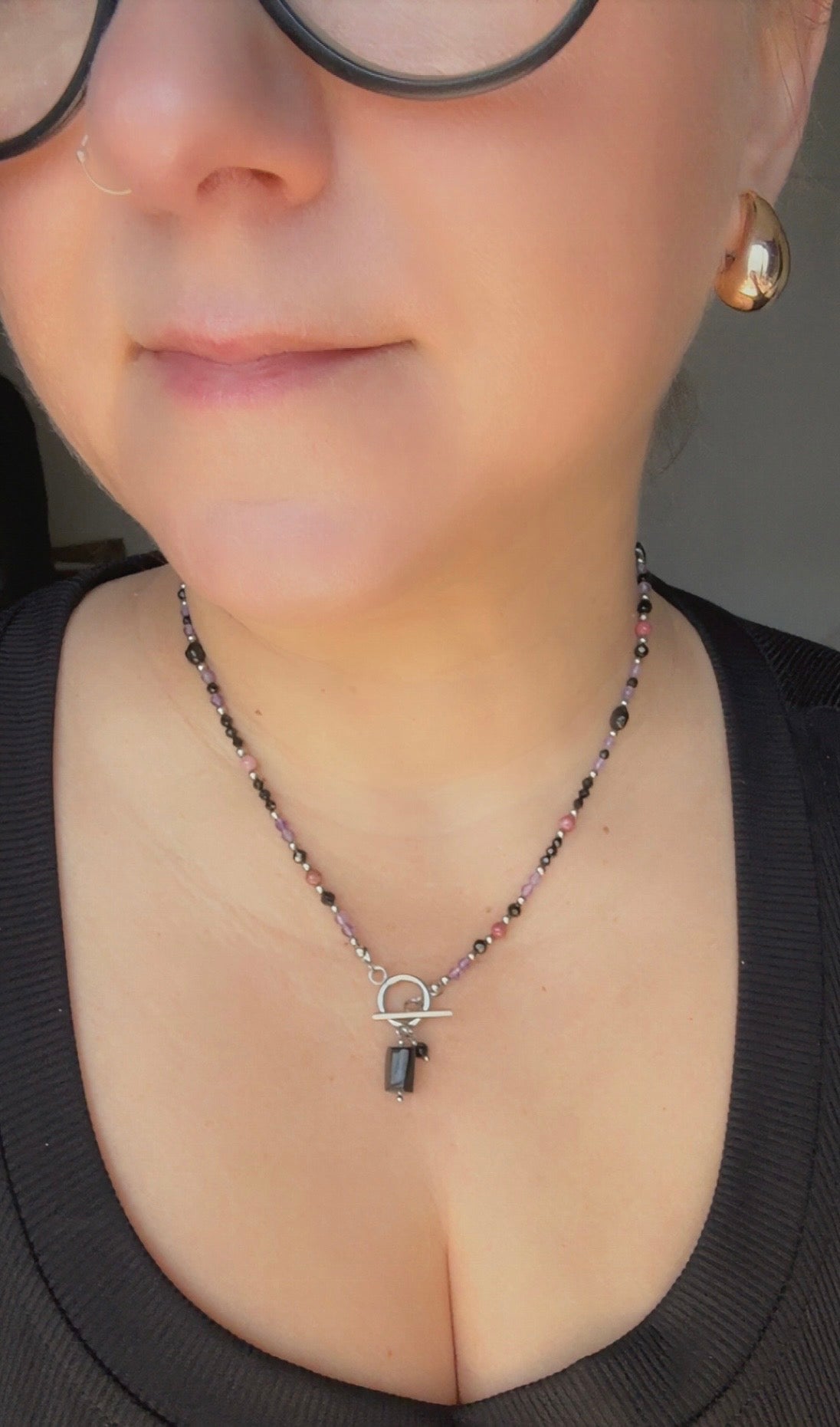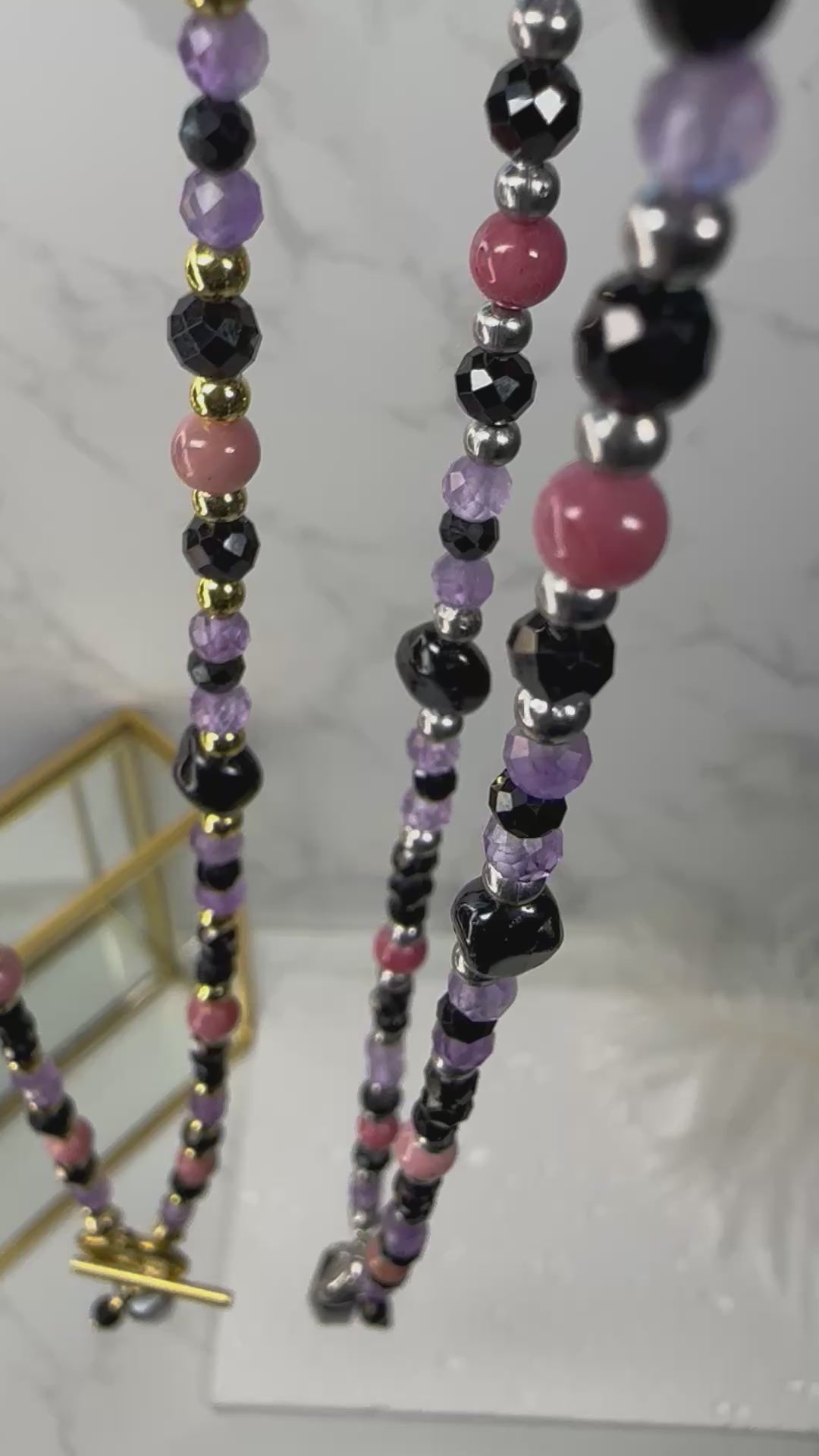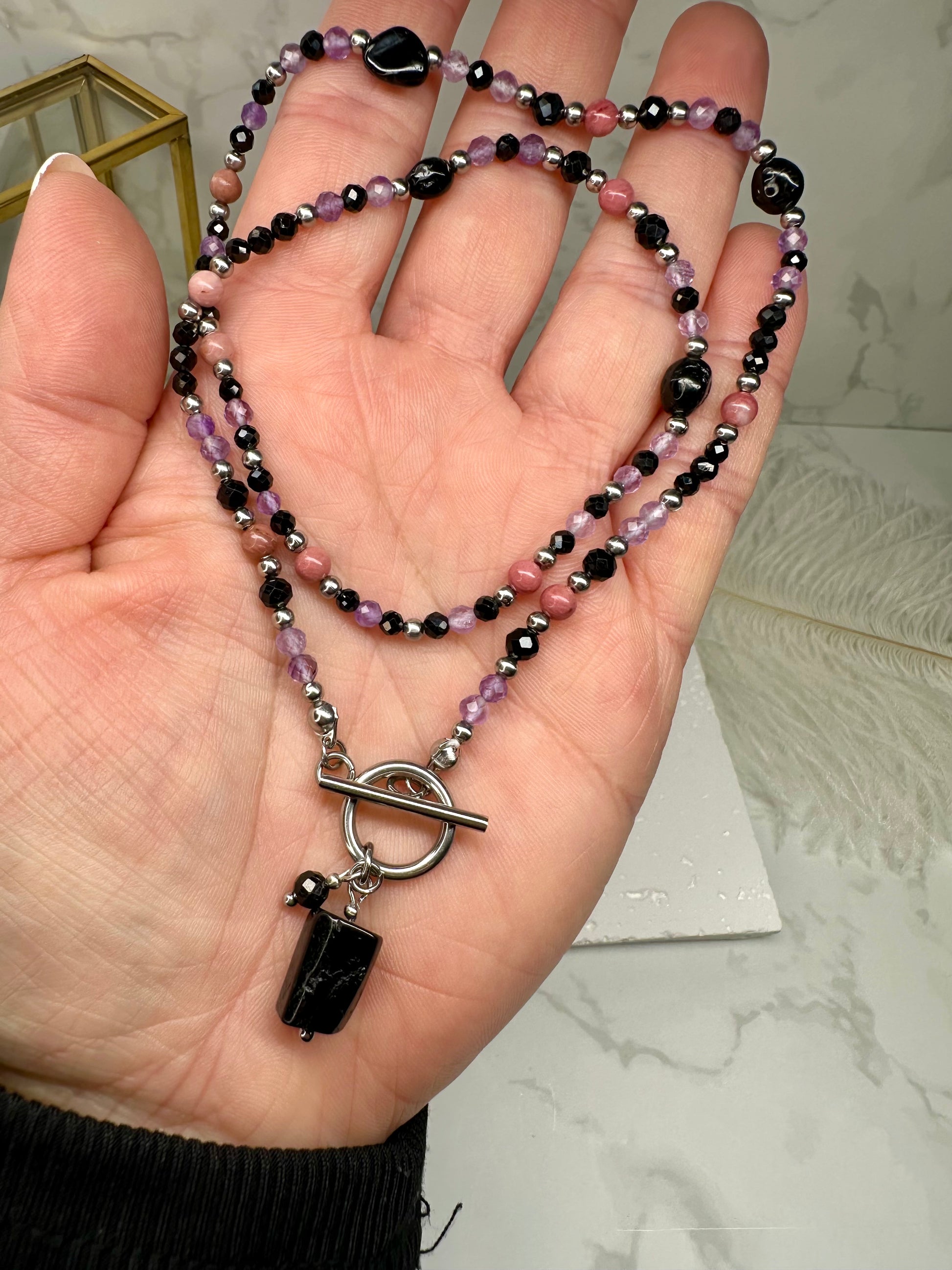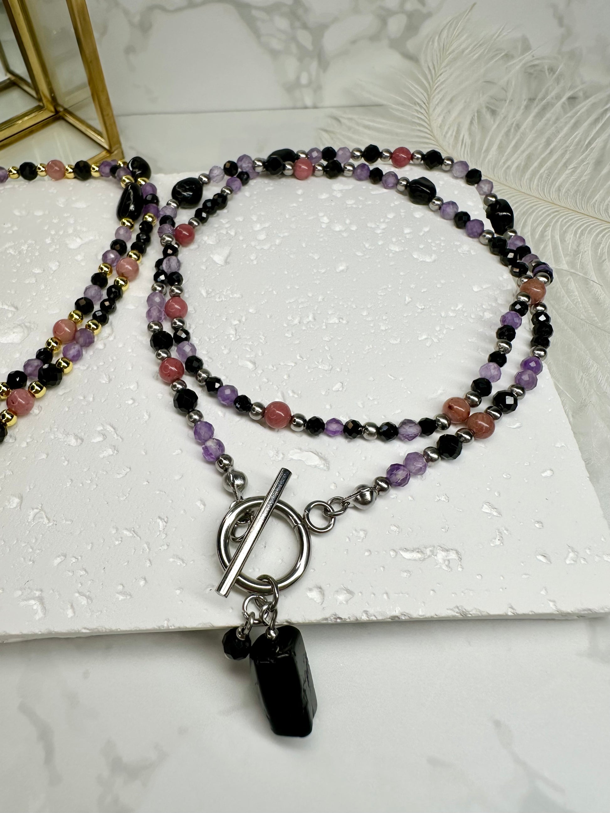 A handmade crystal necklace designed for grounding, emotional balance, and gentle protection. This piece blends three supportive stones — Black Tourmaline, Amethyst, and Rhodonite — chosen for their calming, heart‑healing, and protective energy.