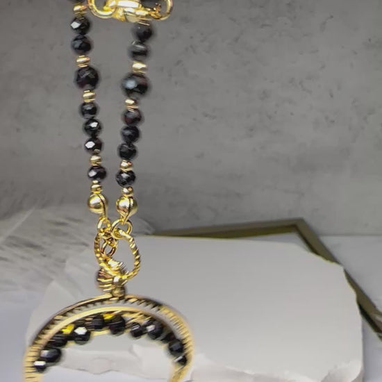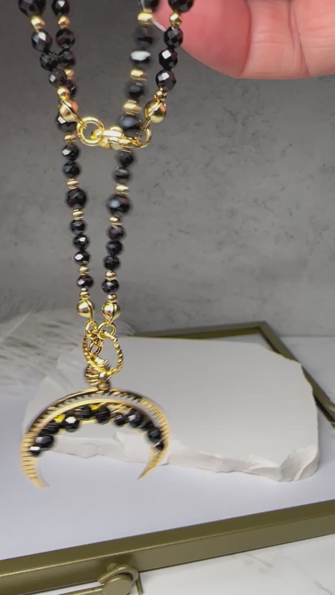 Step into your power with this handcrafted black tourmaline necklace, designed to shield your energy and elevate your presence. Each bead is lovingly handcrafted and seamlessly woven into the crescent moon pendant, creating a talisman of grounding and grace. The pendant features protective black tourmaline and intricate gold detailing, while a smaller charm with a matching black stone adds layered intention—perfect for rituals, daily wear, or gifting to someone who needs a little extra magic.