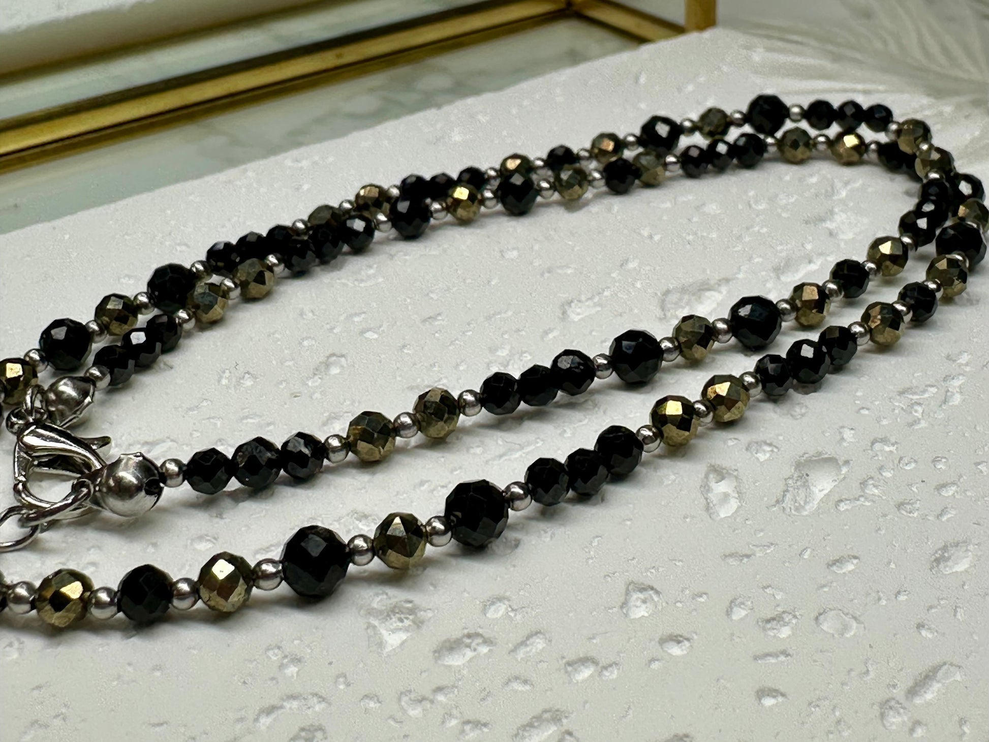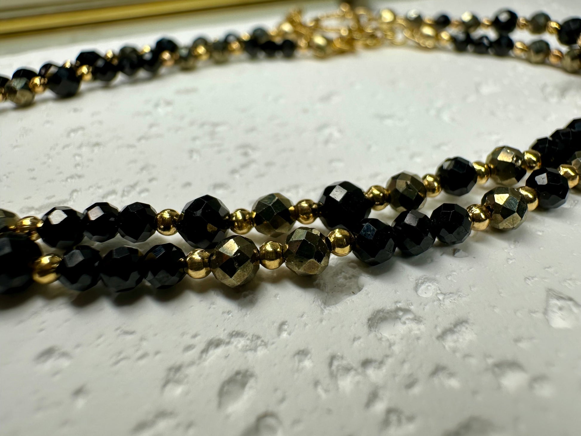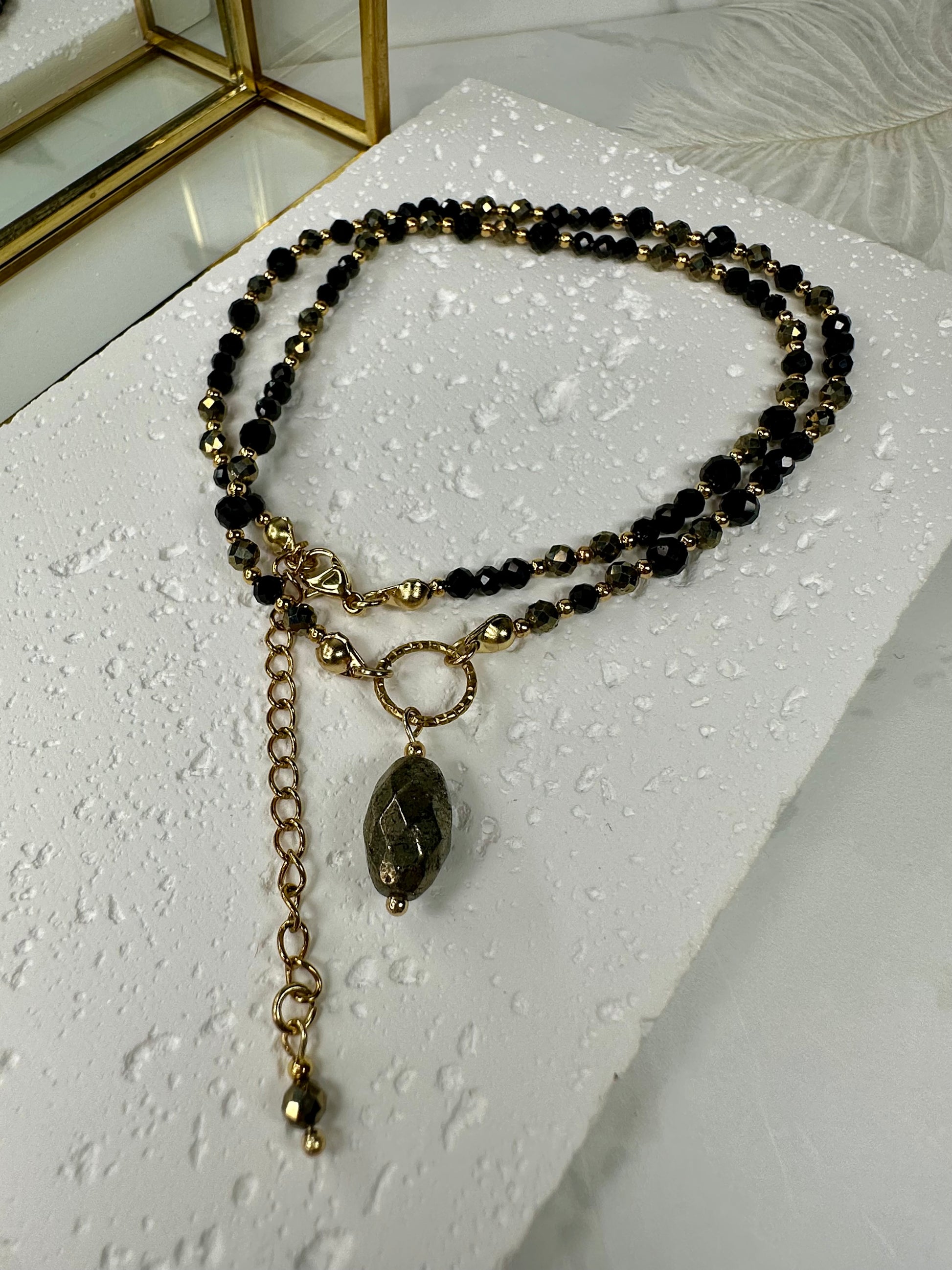A bold, grounding necklace handcrafted with genuine Black Tourmaline and Pyrite — two of the strongest stones for protection, confidence, and energetic shielding. Available in both gold and silver finishes, this piece blends dark, glossy beads with metallic accents for a powerful, modern look.