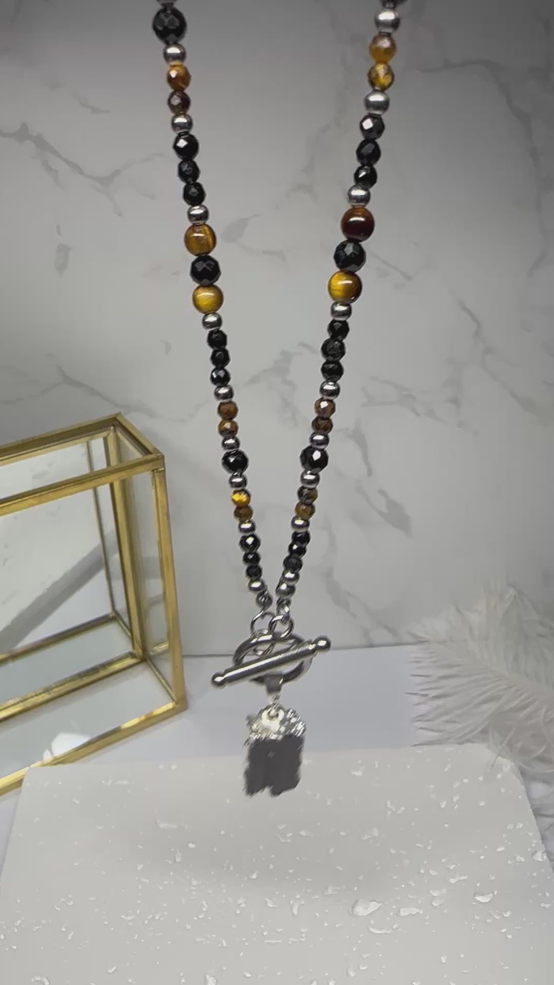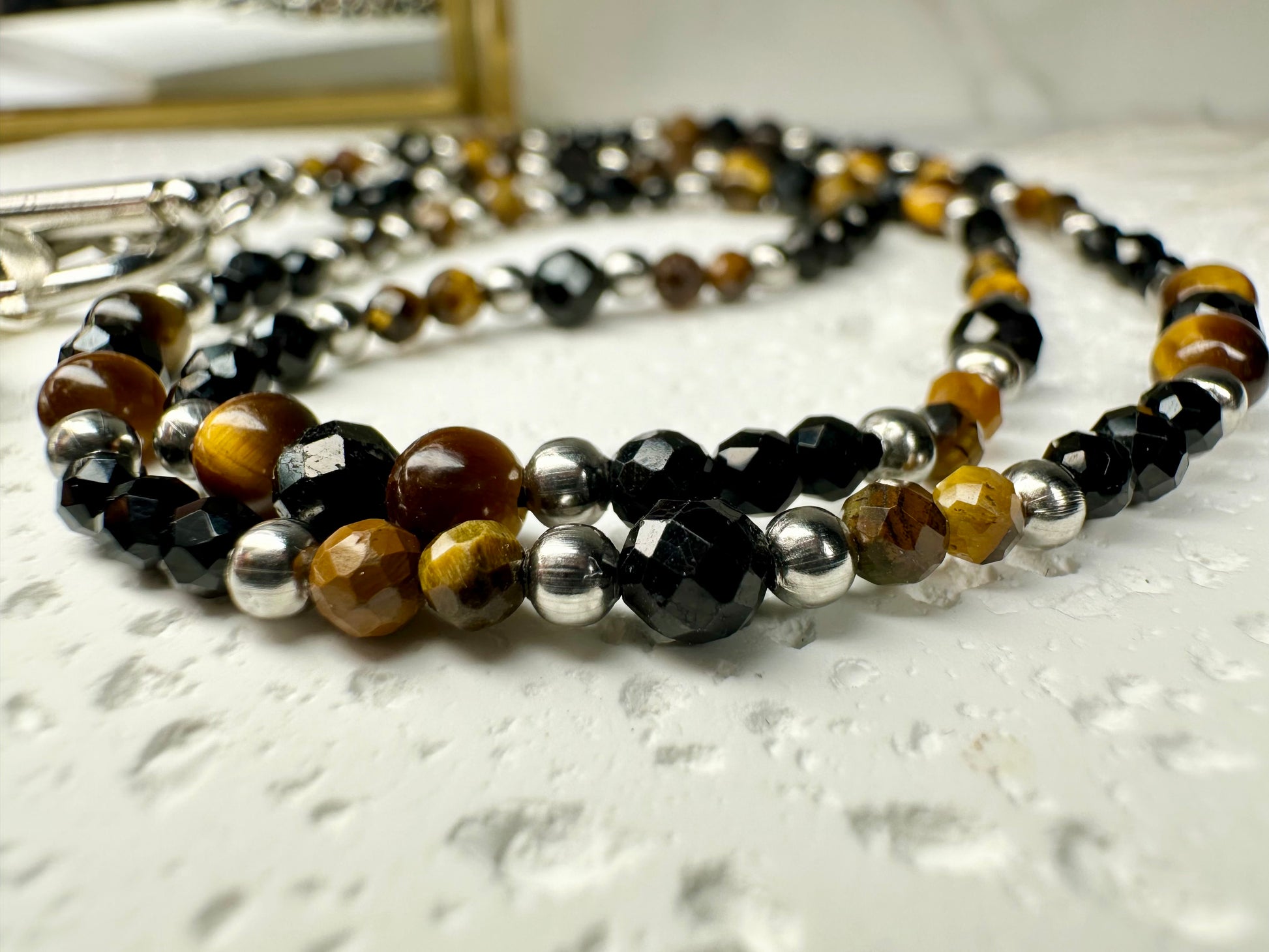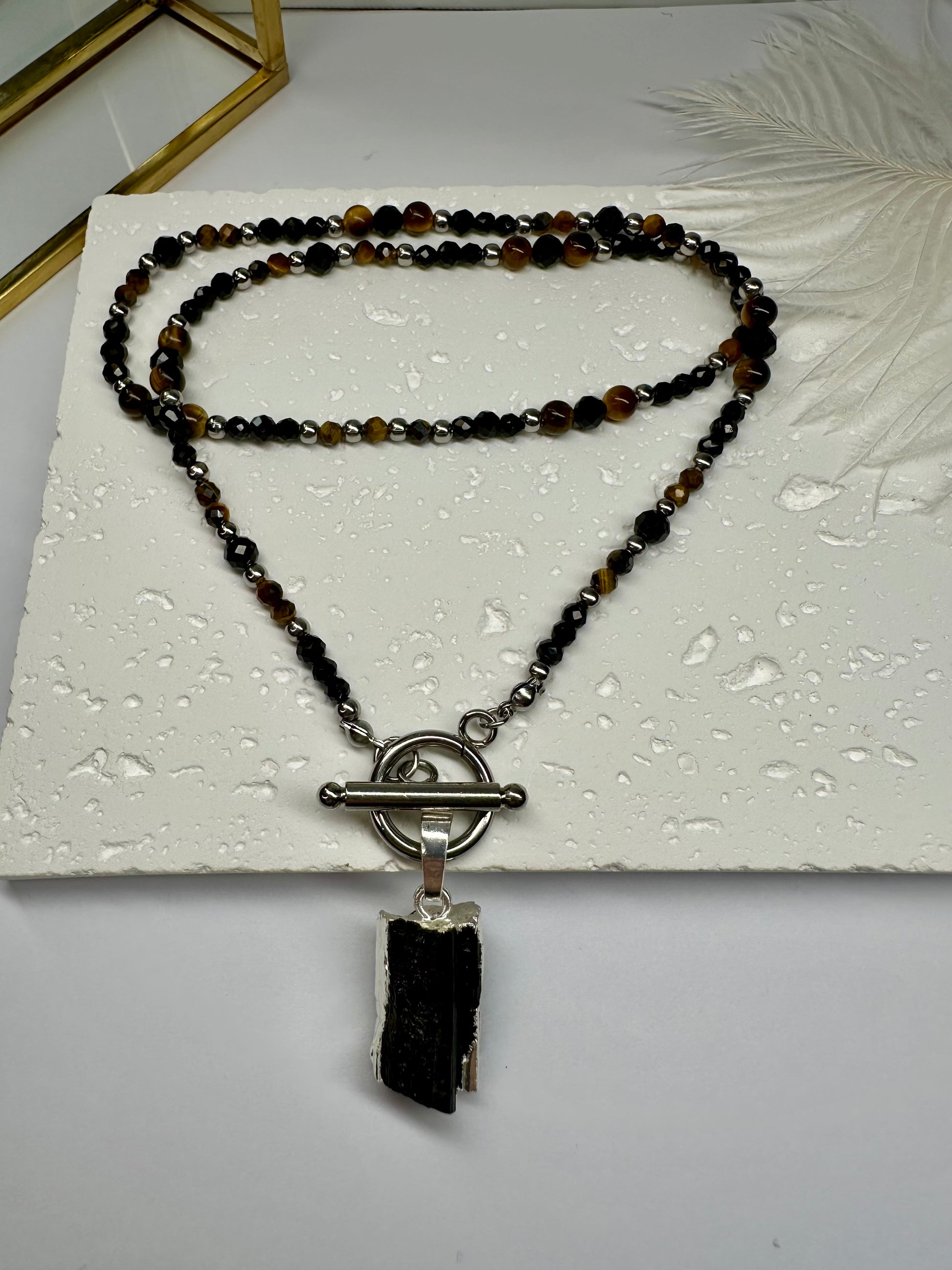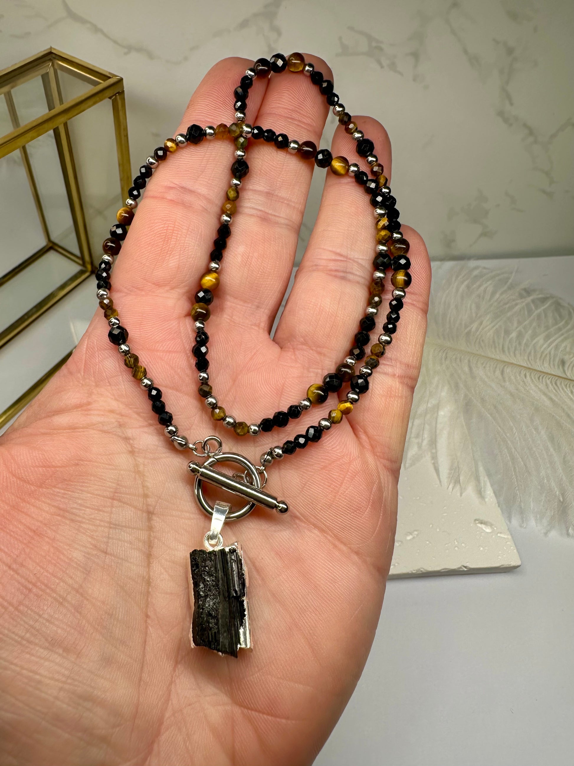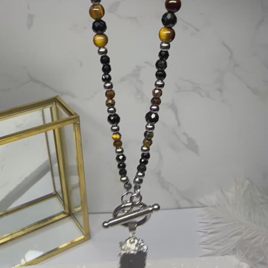 This handmade necklace features a bold pairing of Black Tourmaline and Tiger’s Eye beads. Each bead is chosen for its energetic power and earthy beauty, creating a piece that’s both protective and empowering