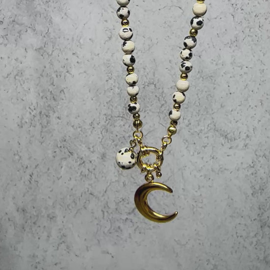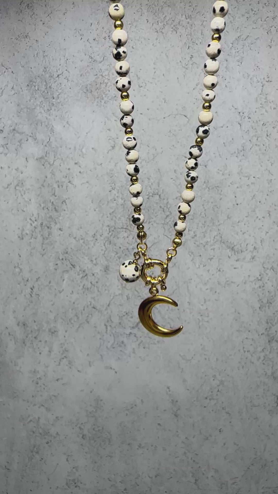 Dalmatian Jasper Beaded Necklace with Gold Crescent Moon Pendant