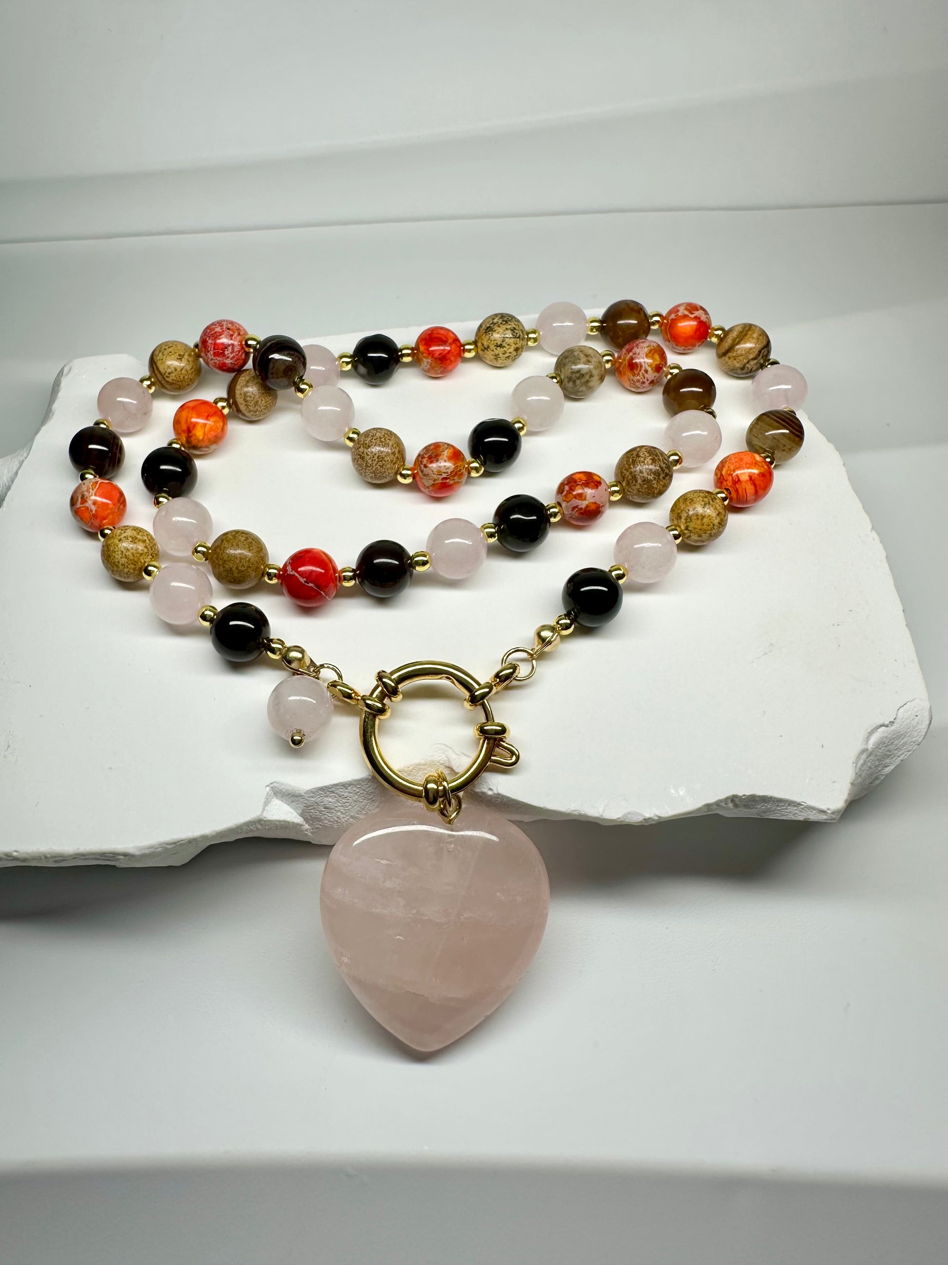 Emotional Balance Necklace – Rose Quartz, Picture Jasper, Striped Agate, Orange Jasper