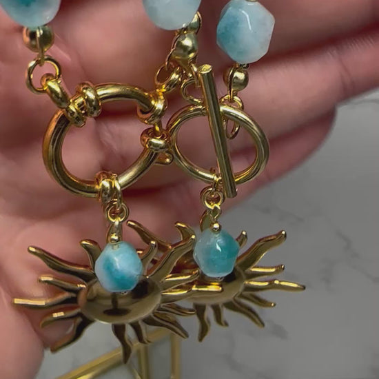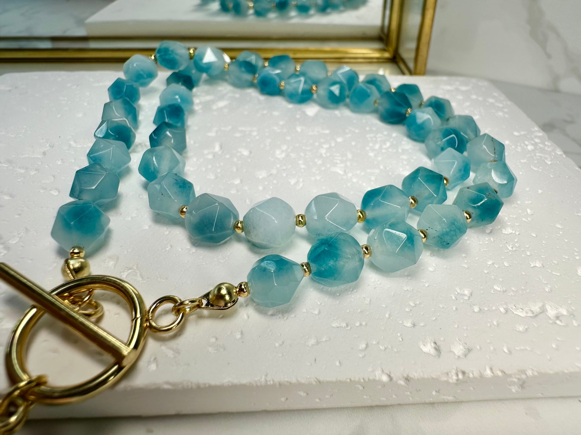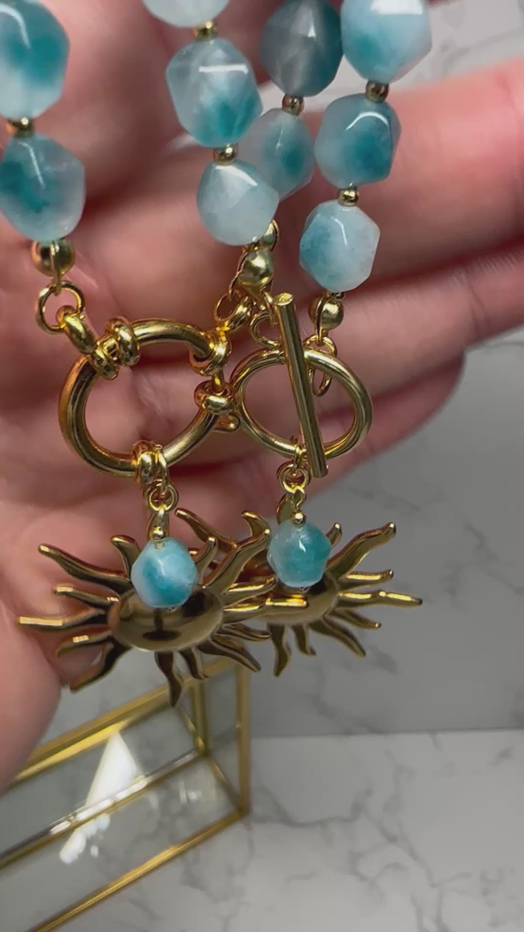 A dreamy, ocean‑inspired necklace handcrafted with faceted Aqua Jade beads in soft blue tones, finished with a radiant gold sun pendant. This piece blends calming gemstone energy with a warm, summery aesthetic — perfect for beach days, holidays, or adding a touch of sunshine to your everyday style.