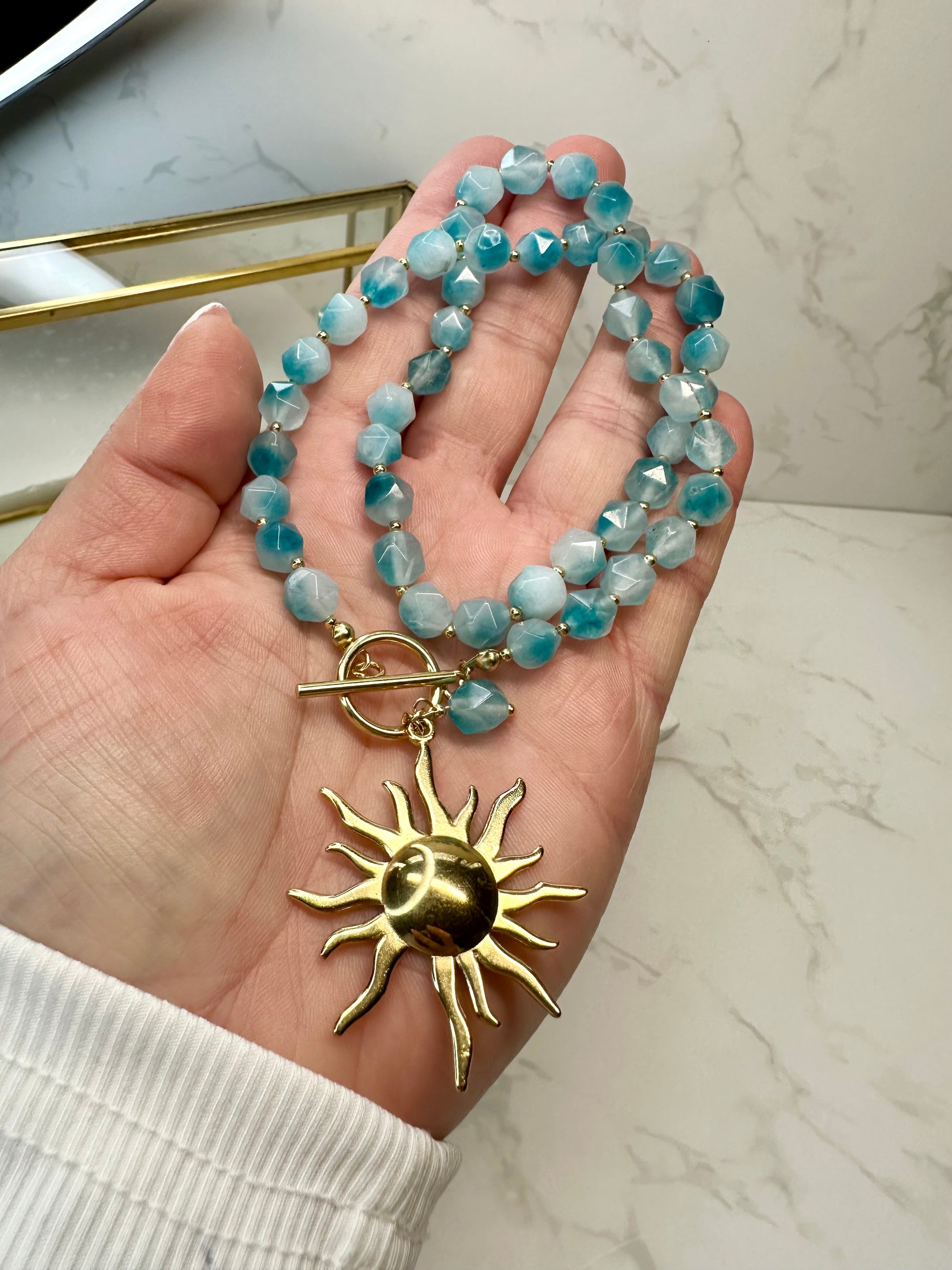 Handmade Beaded Aqua Jade Necklace with Sun Pendant
