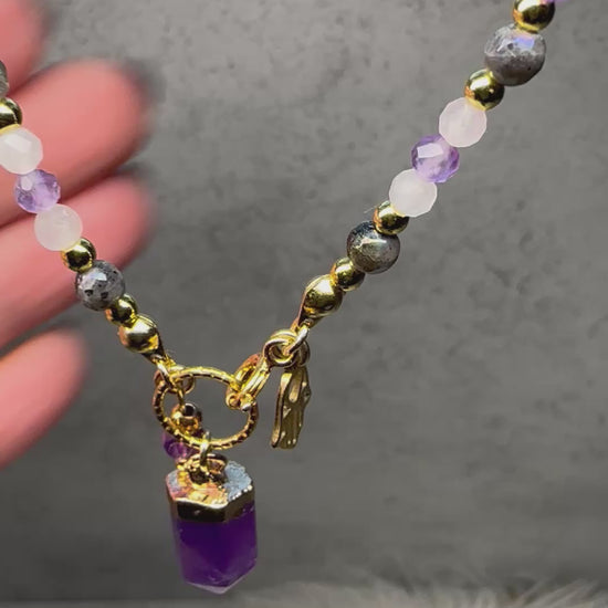 Labradorite, Rose Quartz & Amethyst Necklace – Handmade Beaded Crystal Necklace for Intuition, Love & Protection
