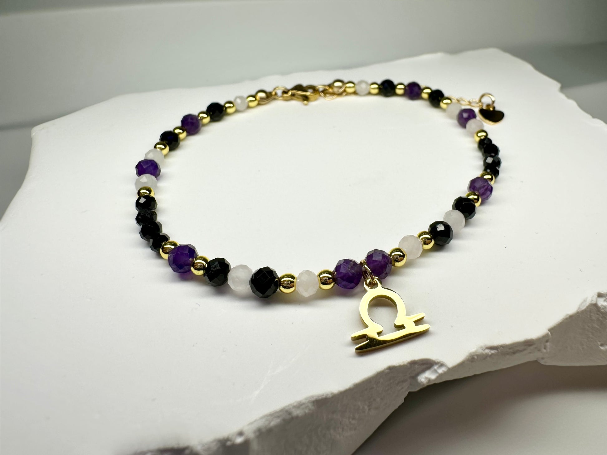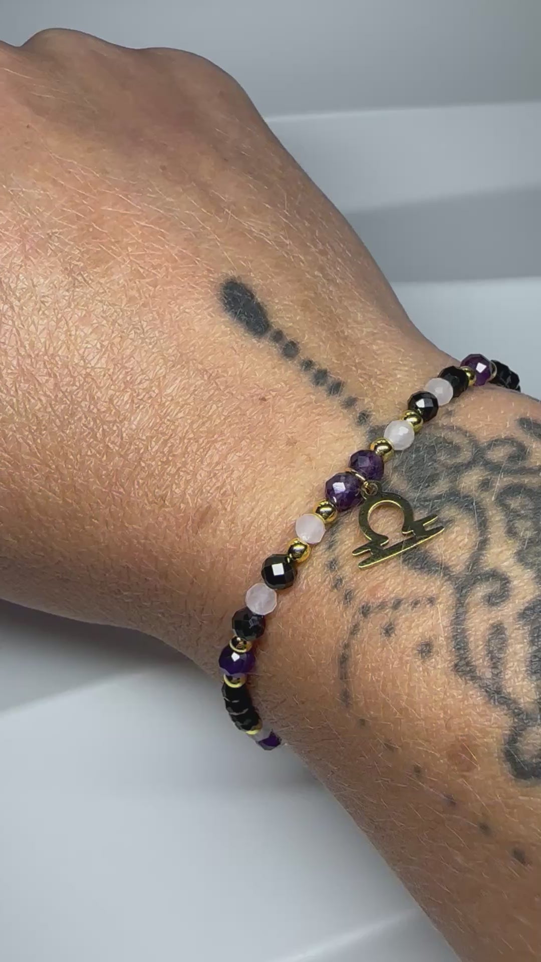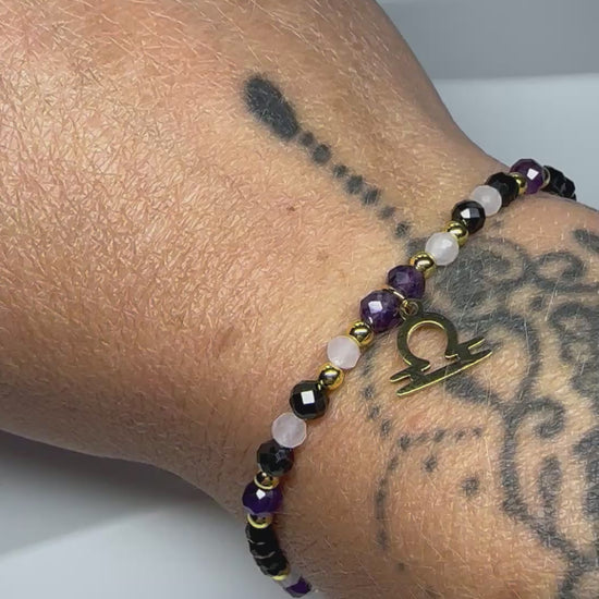 Libra Zodiac Bracelet – Black Tourmaline, Amethyst & Rose Quartz | Handmade Spiritual Jewellery