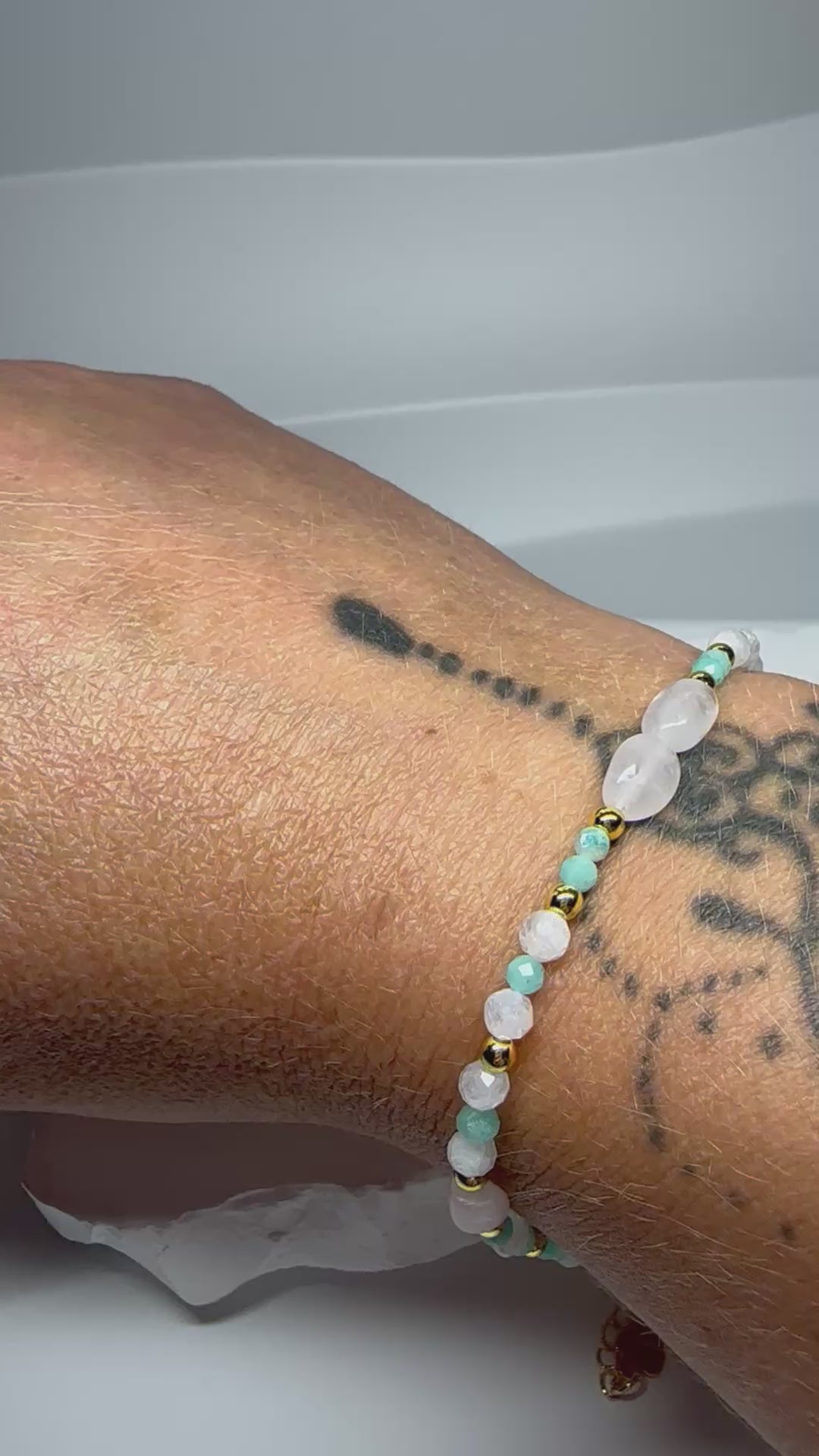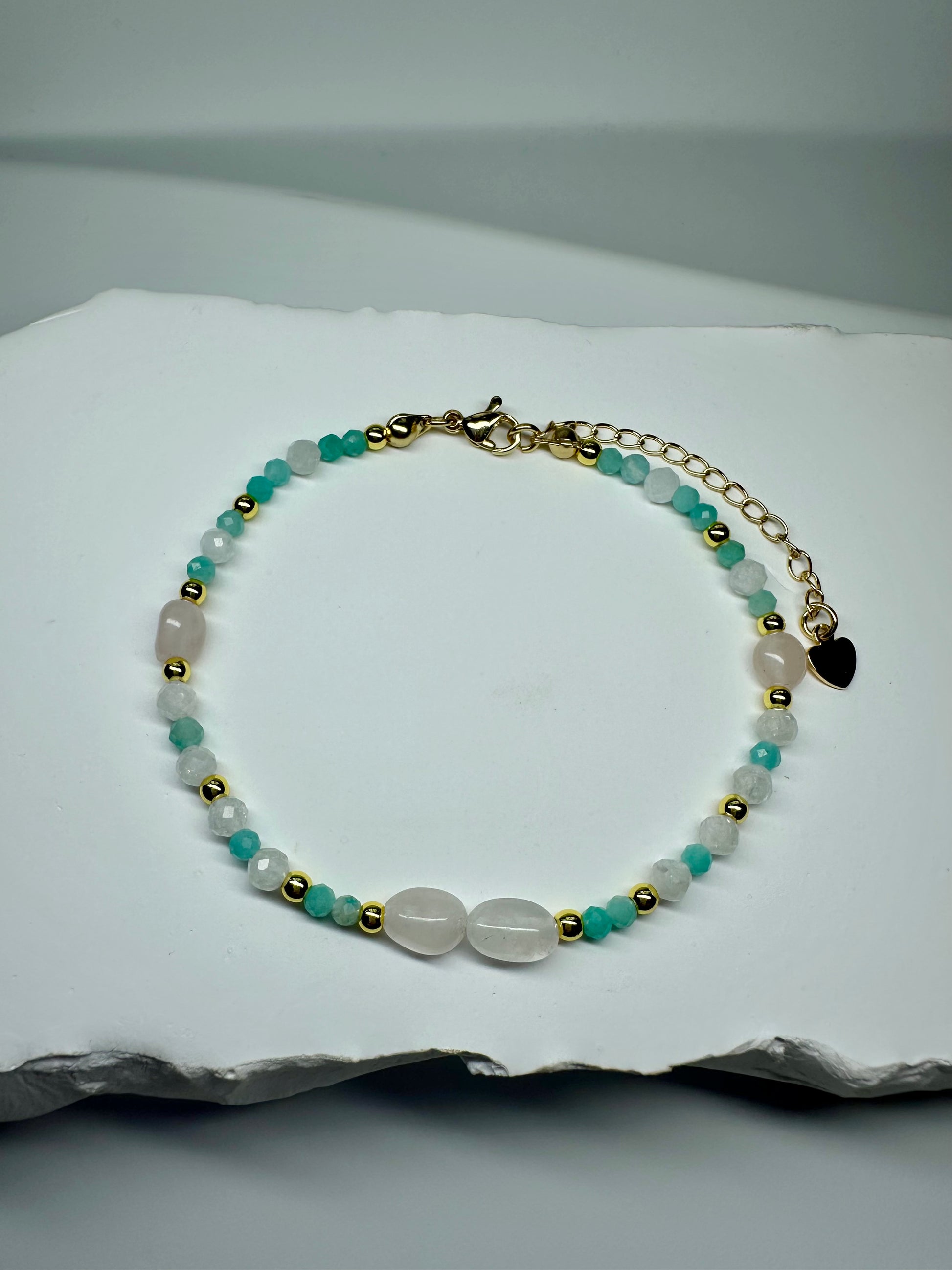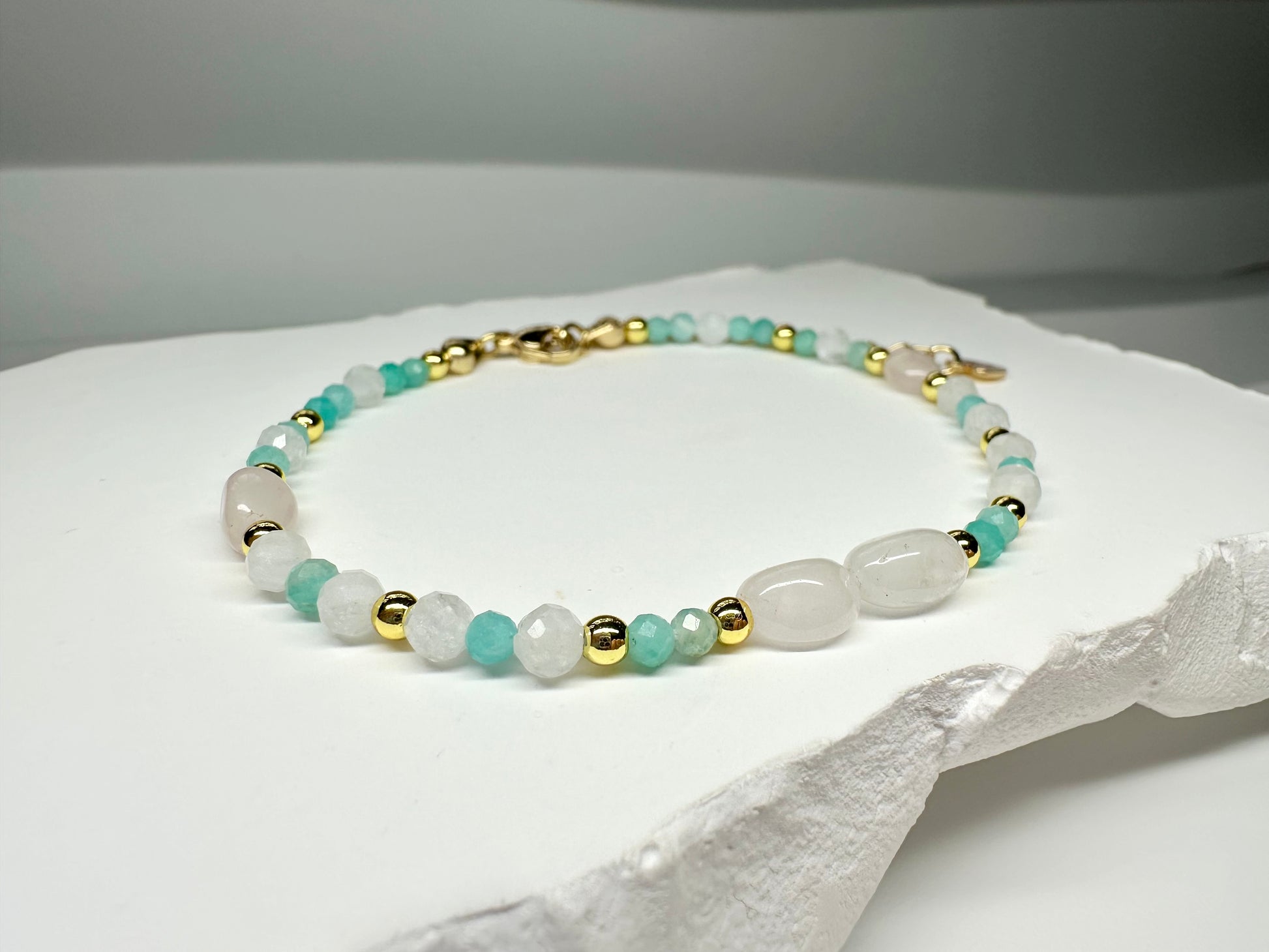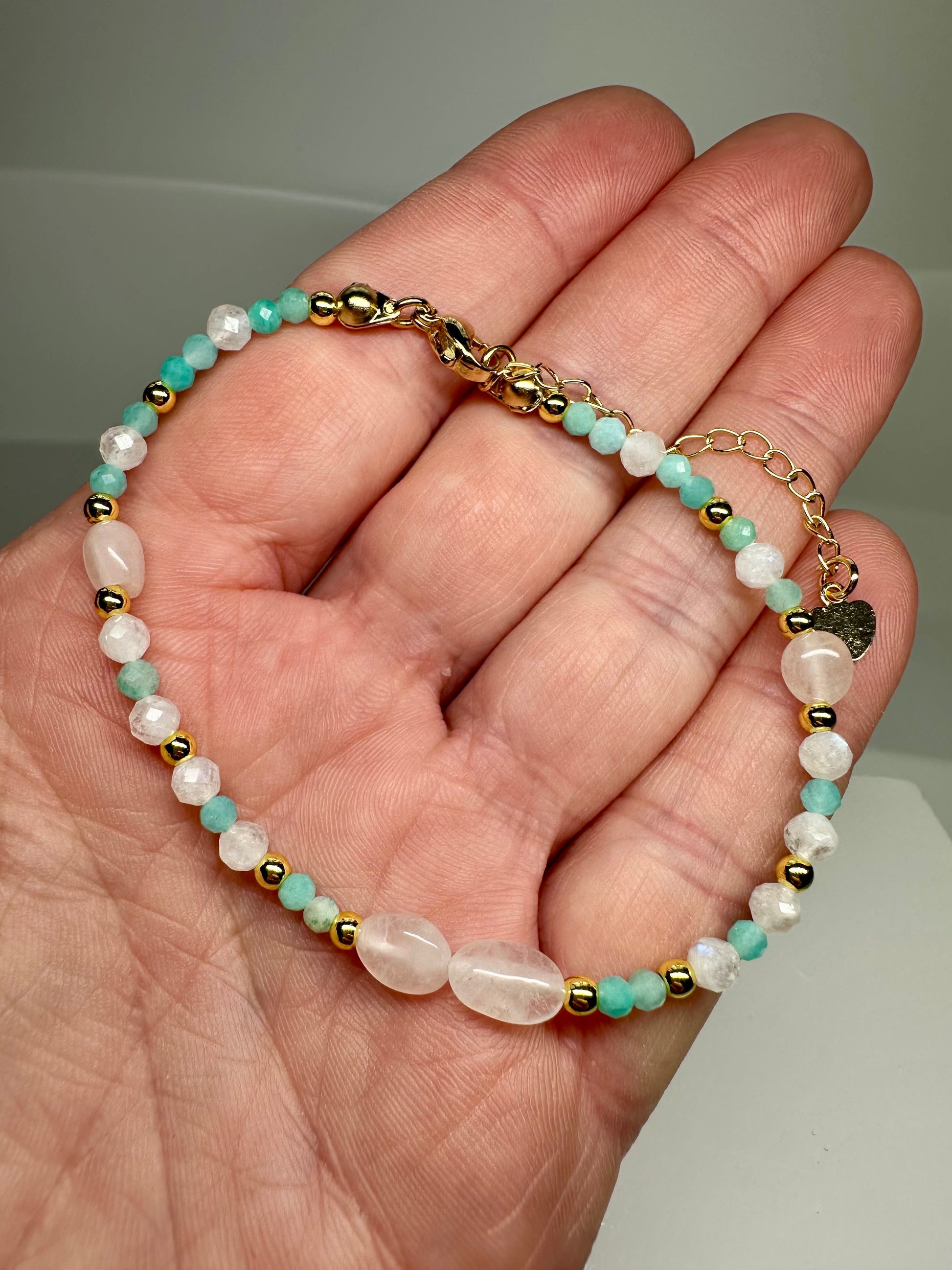 This handcrafted gemstone bracelet blends the soft power of Moonstone, Rose Quartz, and Amazonite—a trio designed to support emotional clarity, self-love, and inner strength. Whether you’re navigating change or simply want to feel more aligned, this dainty bracelet is your daily reminder to trust your intuition and lead with love.