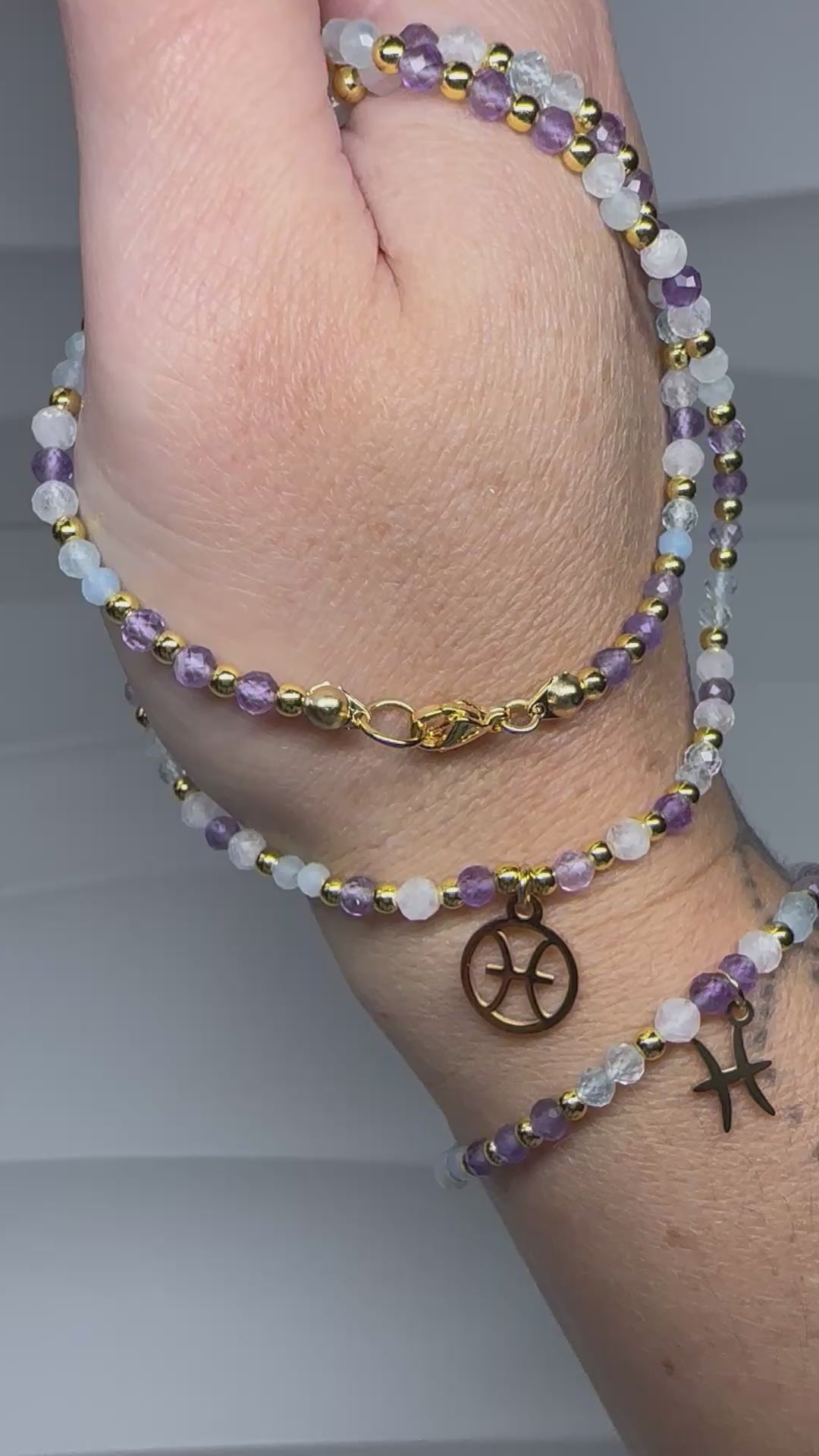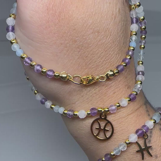 Pisces Crystal Jewellery Set β Handmade Beaded Aquamarine, Moonstone & Amethyst Necklace + Bracelet for Intuition & Calm