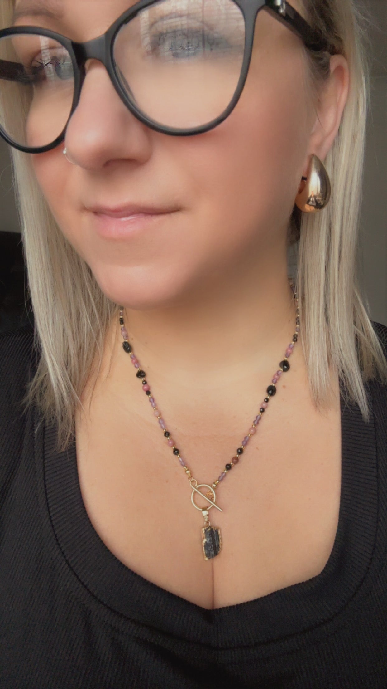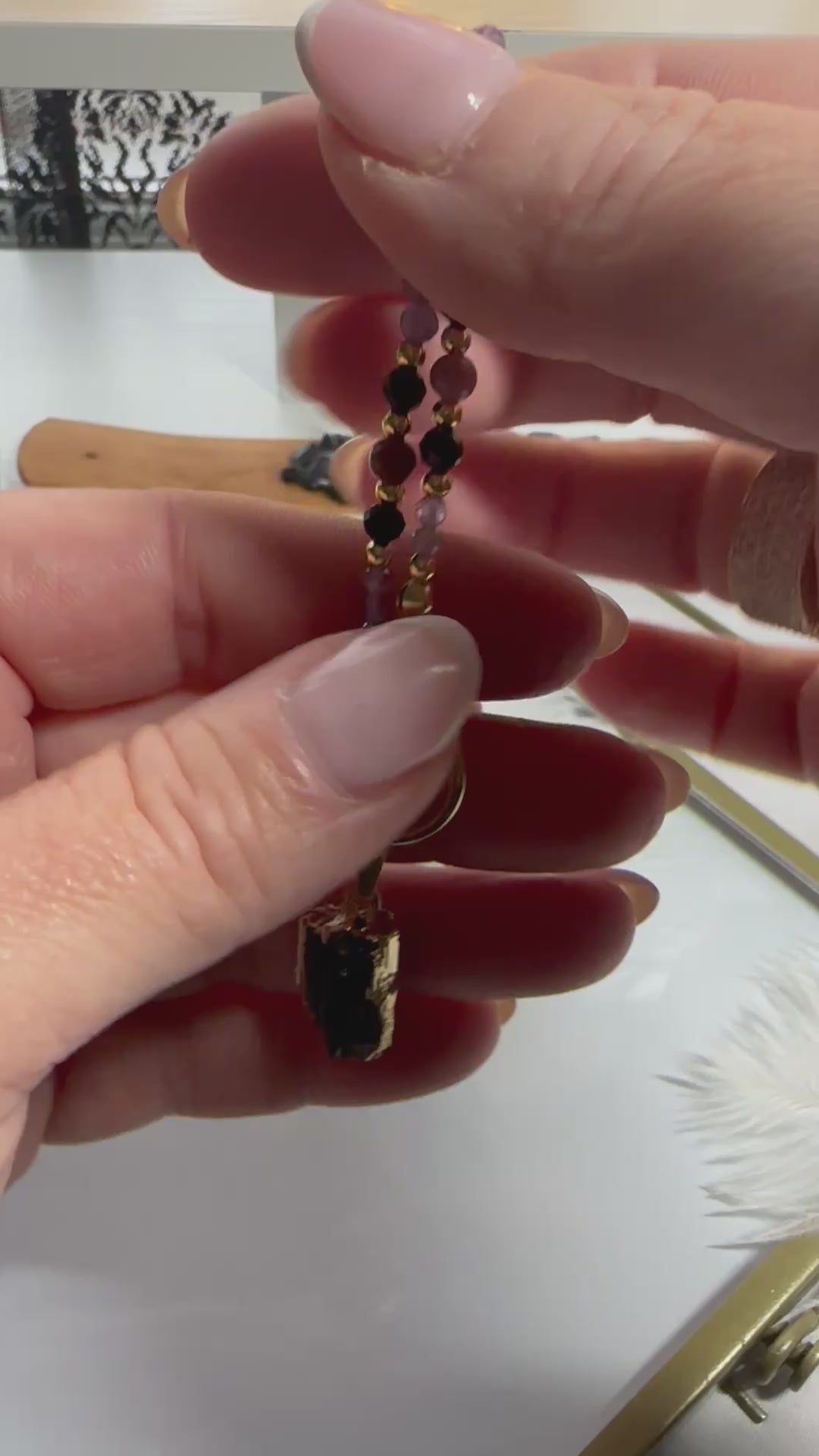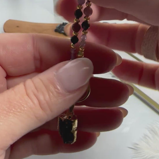 ✨ Featuring a raw Black Tourmaline pendant in a gold setting, framed by a rhythmic blend of Rhodonite, Amethyst, and gold-accented beads, this piece is designed to support your heart, shield your energy, and awaken your inner wisdom.