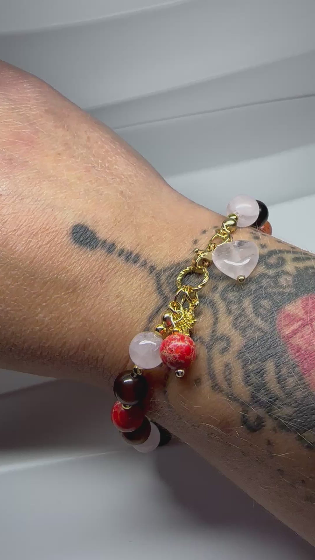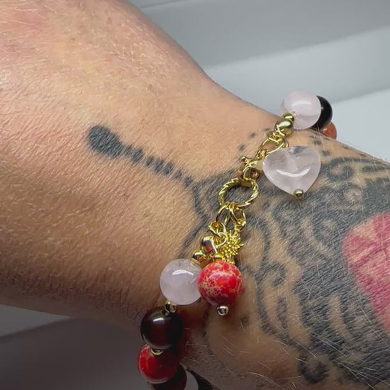 Reconnect with your heart and root your energy with this handmade crystal bracelet featuring Rose Quartz, Picture Jasper, Striped Agate, and Imperial Orange Jasper