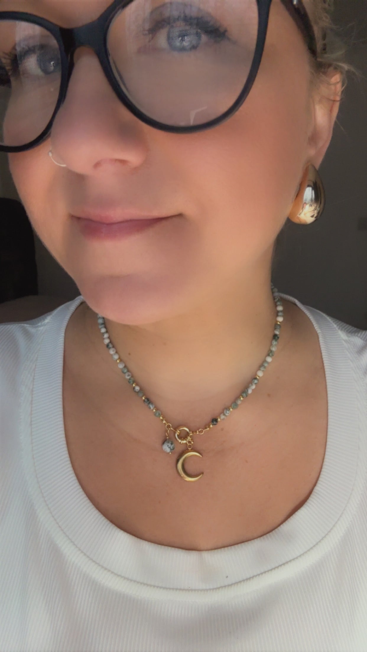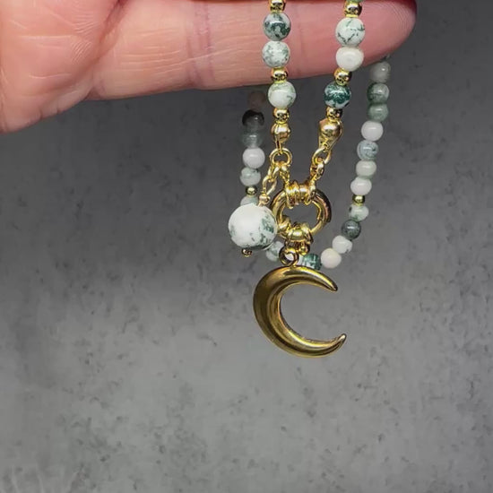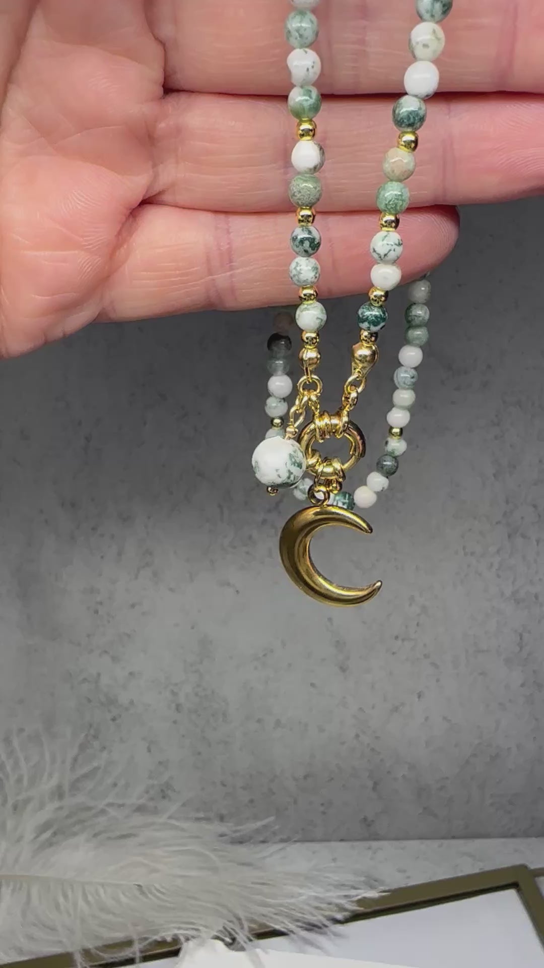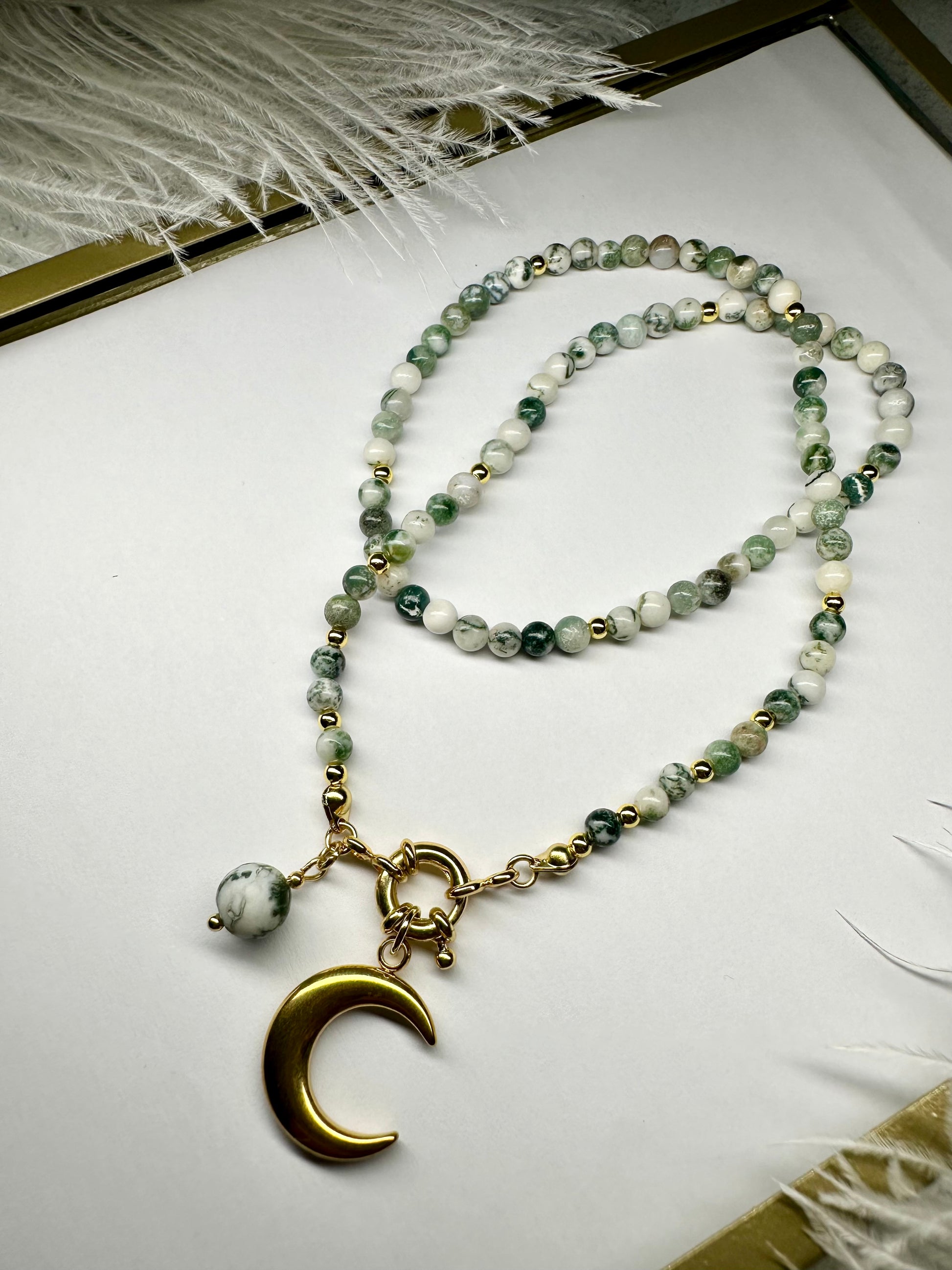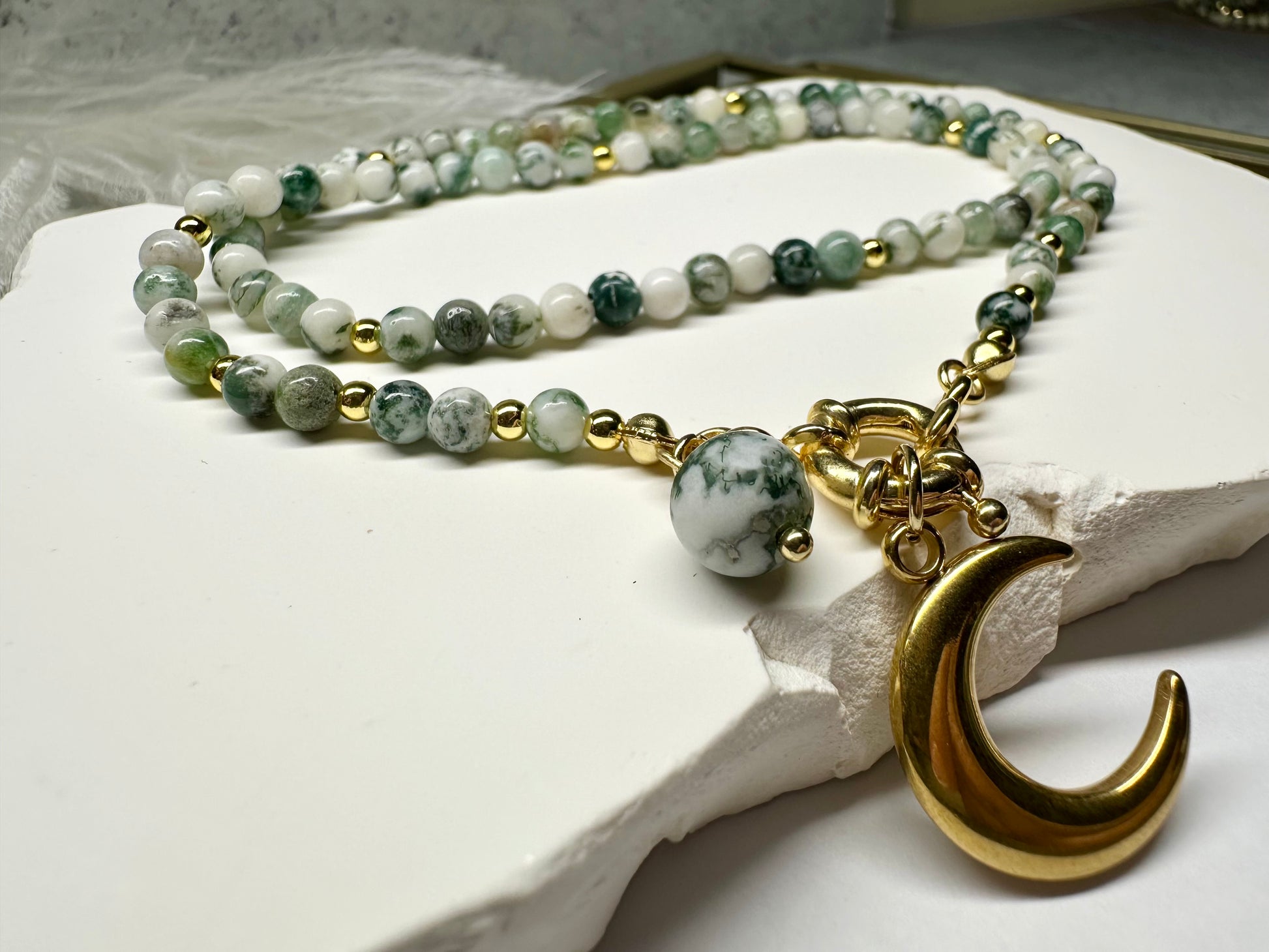 Tree Agate Beaded Necklace with Gold Crescent Moon Pendant
