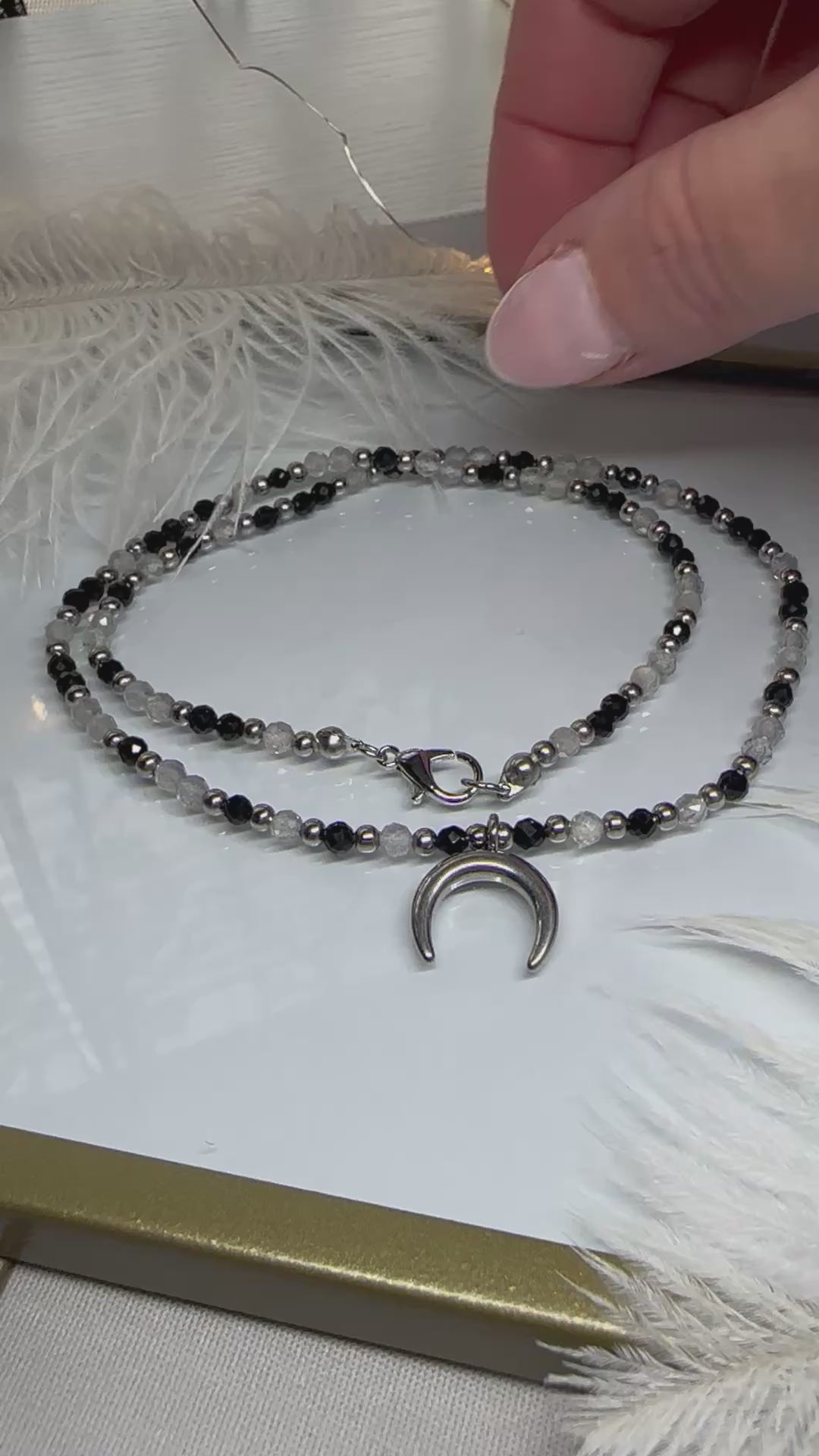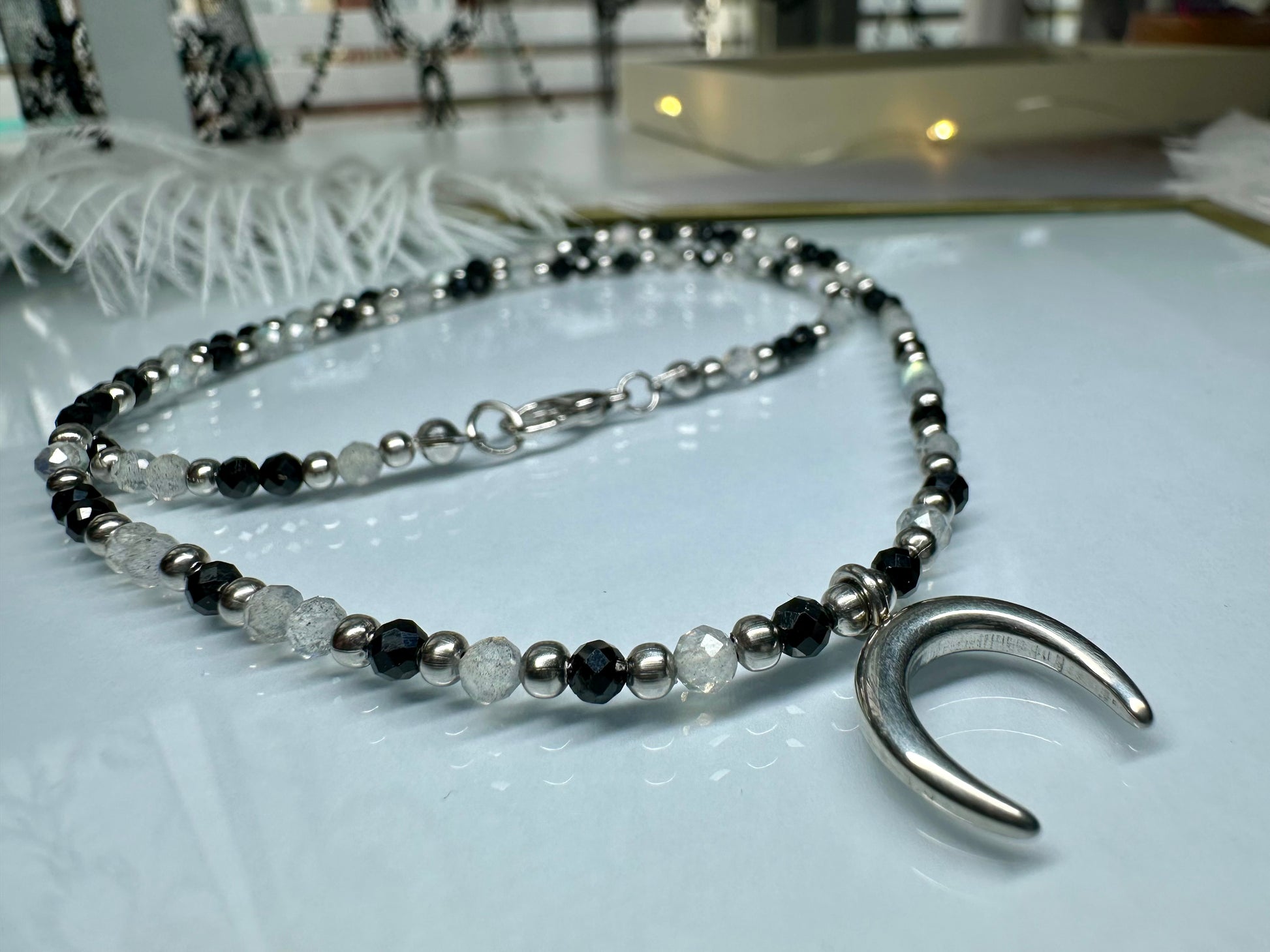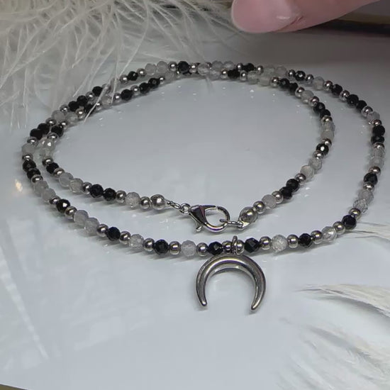 Channel grounding energy and lunar intuition with this handmade beaded necklace featuring Grey Moonstone, Black Tourmaline, and a stainless steel moon pendant.