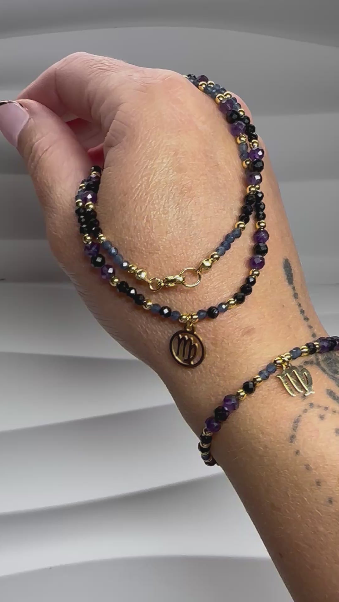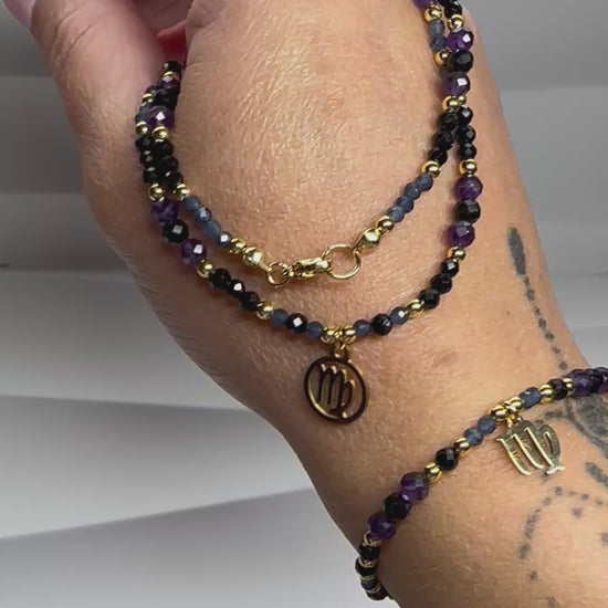 Embrace your Virgo energy with this handmade crystal jewelry set, featuring a matching necklace and bracelet crafted with black tourmaline, sapphire, and amethyst. Designed to support grounding, intuition, and emotional clarity, this set blends celestial symbolism with everyday elegance.